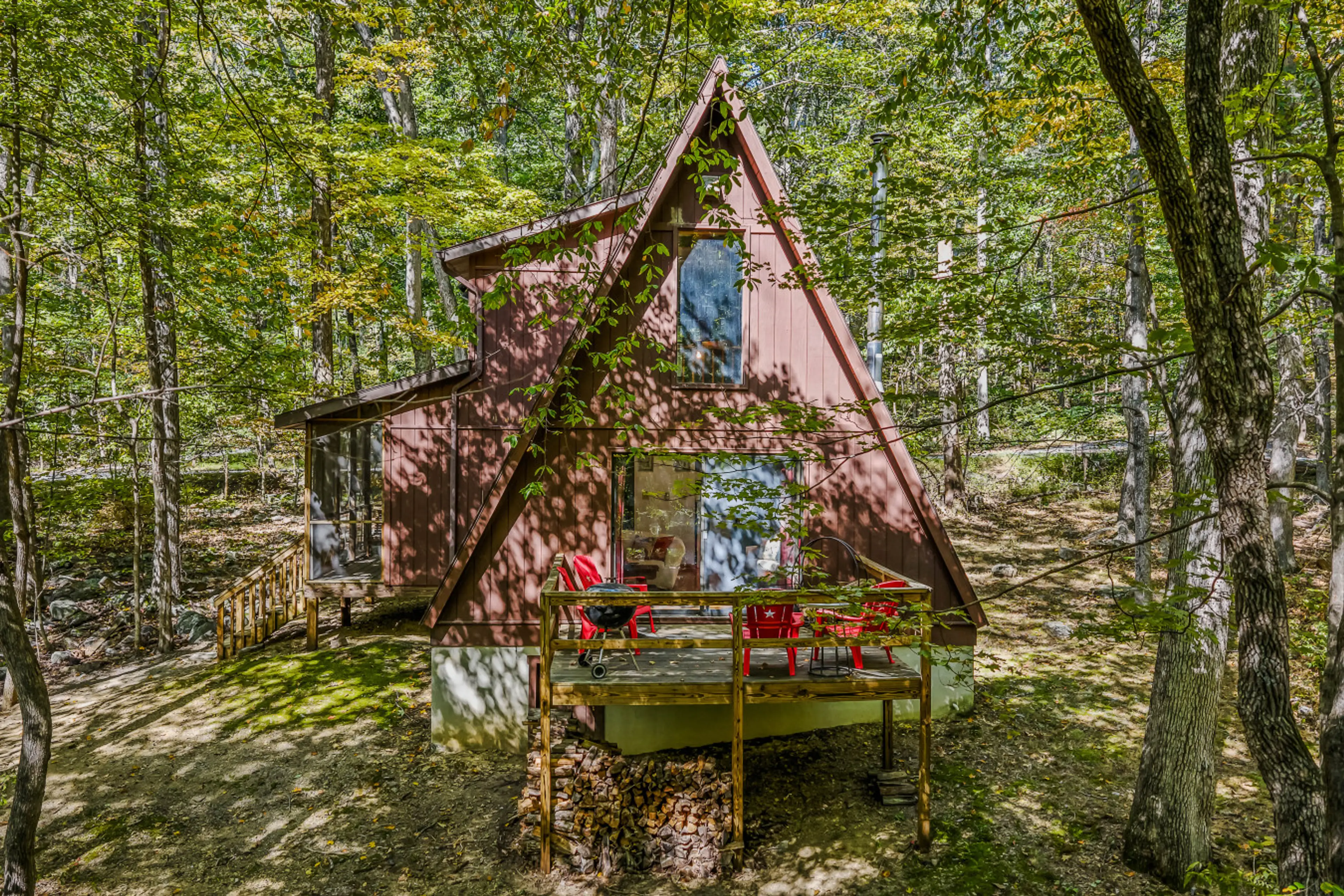 Above Sleepy Hollow - Rooftop deck, amazing views, hot tub, pet friendly, screen porch, wifi, EV charger, games, trails, wood stove, charcoal grill, lake access, king bed
